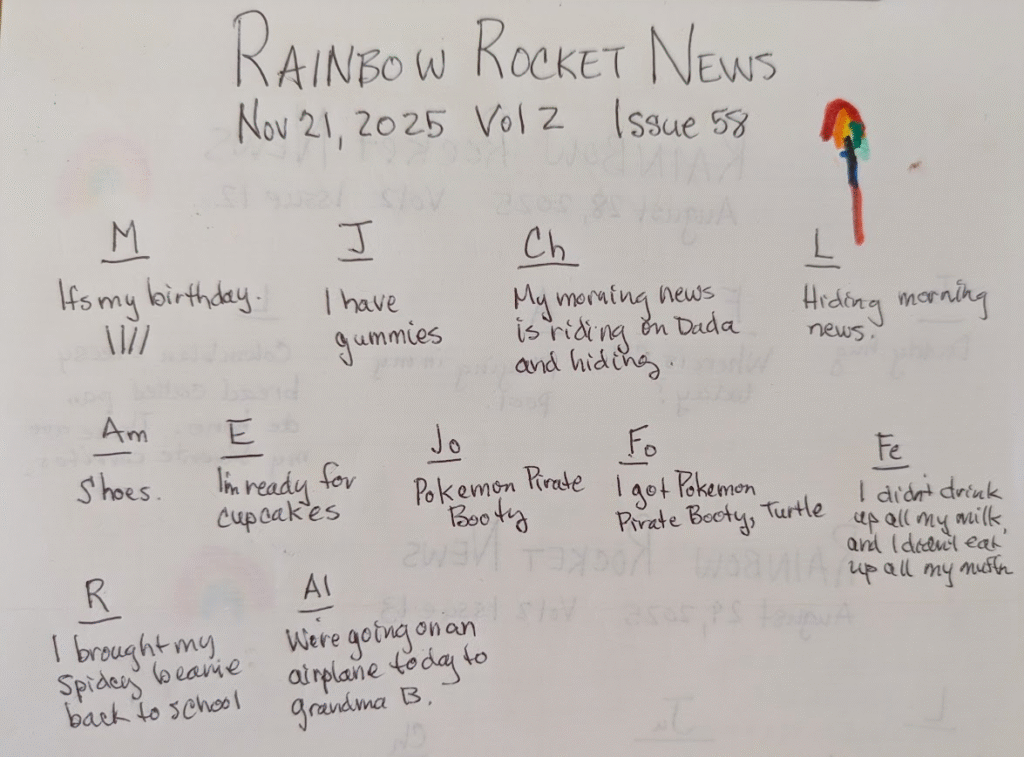 P.S. The slide was super slippery fast. You all went flying down it. A couple of you even climbed up it. And it was too wet to write our news today.
