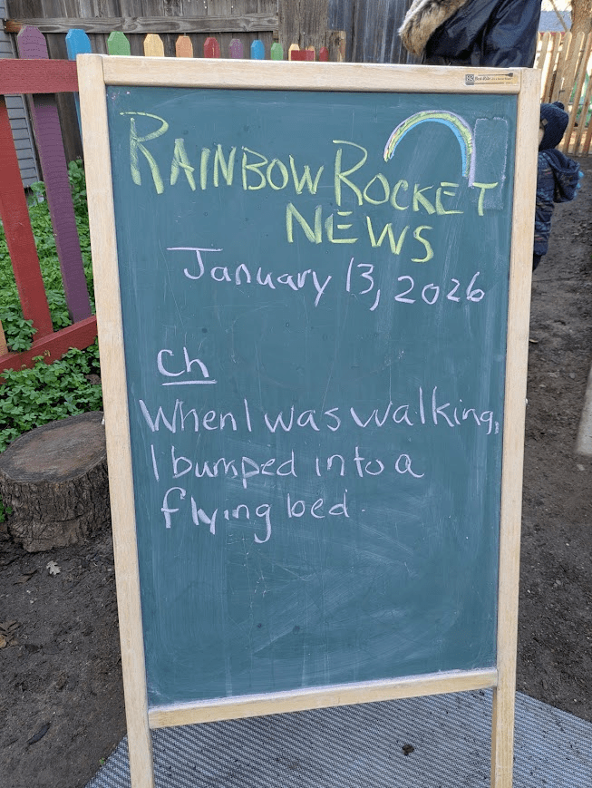 We all put on our rain gear. We tested out our boots. Two of you ran all the way around the bike path. Then we tried jumping. You had an idea to jump off the edge of the sandbox to give us extra height. Then you did a running jump.