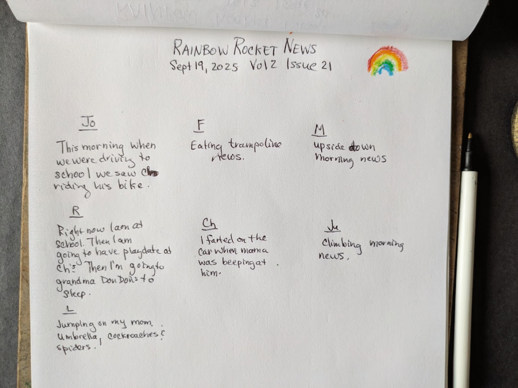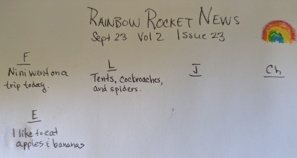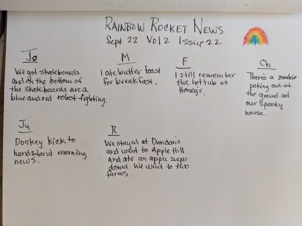 P.S. Morning Meeting with Rainbow Rocket News will begin again next week. This week I am meeting with your grownups in the morning. Thank you for this time.