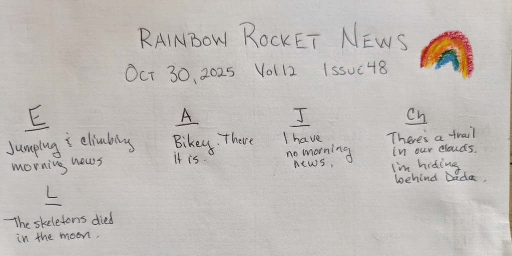 They ran to the Hello Goodbye Gate. They ran up the ramp. They slid down the slide. One child had a box. It wasn’t a box. It was a shell. It was a house. Soon three children had houses. One child rolled in their house like a snail.