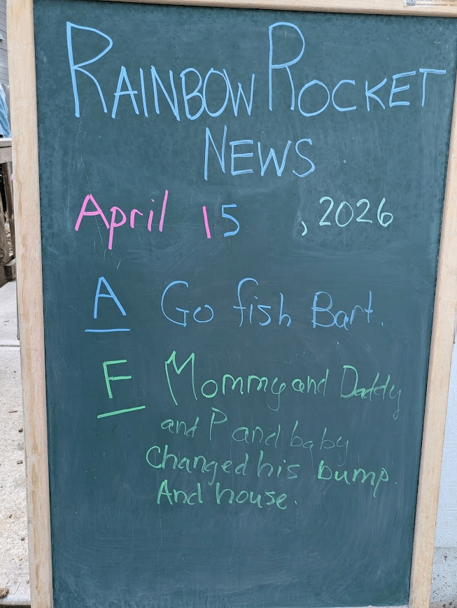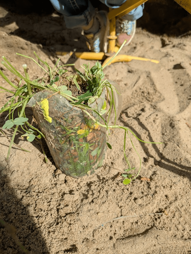 Then they went on the road. They packed up their drums and sticks and headed out. Their next gig was at Mud Mountain. Over in the Mud Kitchen, someone made cake with sprinkles. It was a pitcher cake, and I thought it looked delicious, so I took a picture.